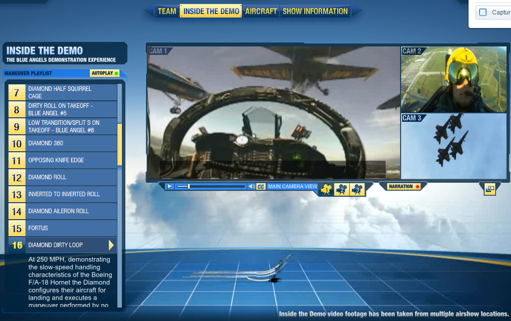 Honestly, if there is one piece of the site that I can single out and say it is required viewing, it’s the Inside the Demo page. This particular page offers unparalleled insights into both the C-130 and F-18 demos. Basically, it provides three camera views of every maneuver, an animation, and an explanation of the maneuver. For the Fat Albert demo, there are front-facing and rear-facing views inside the cockpit as well as an external view. Similarly, the team demo includes shots from the Boss’ cockpit, shots from cockpit of the slot position, shots from the solos. The amount of video and perspectives available are amazing and, in case you don’t want to watch the entire show, you can select specific maneuvers. The only thing better would be actually getting to ride along.